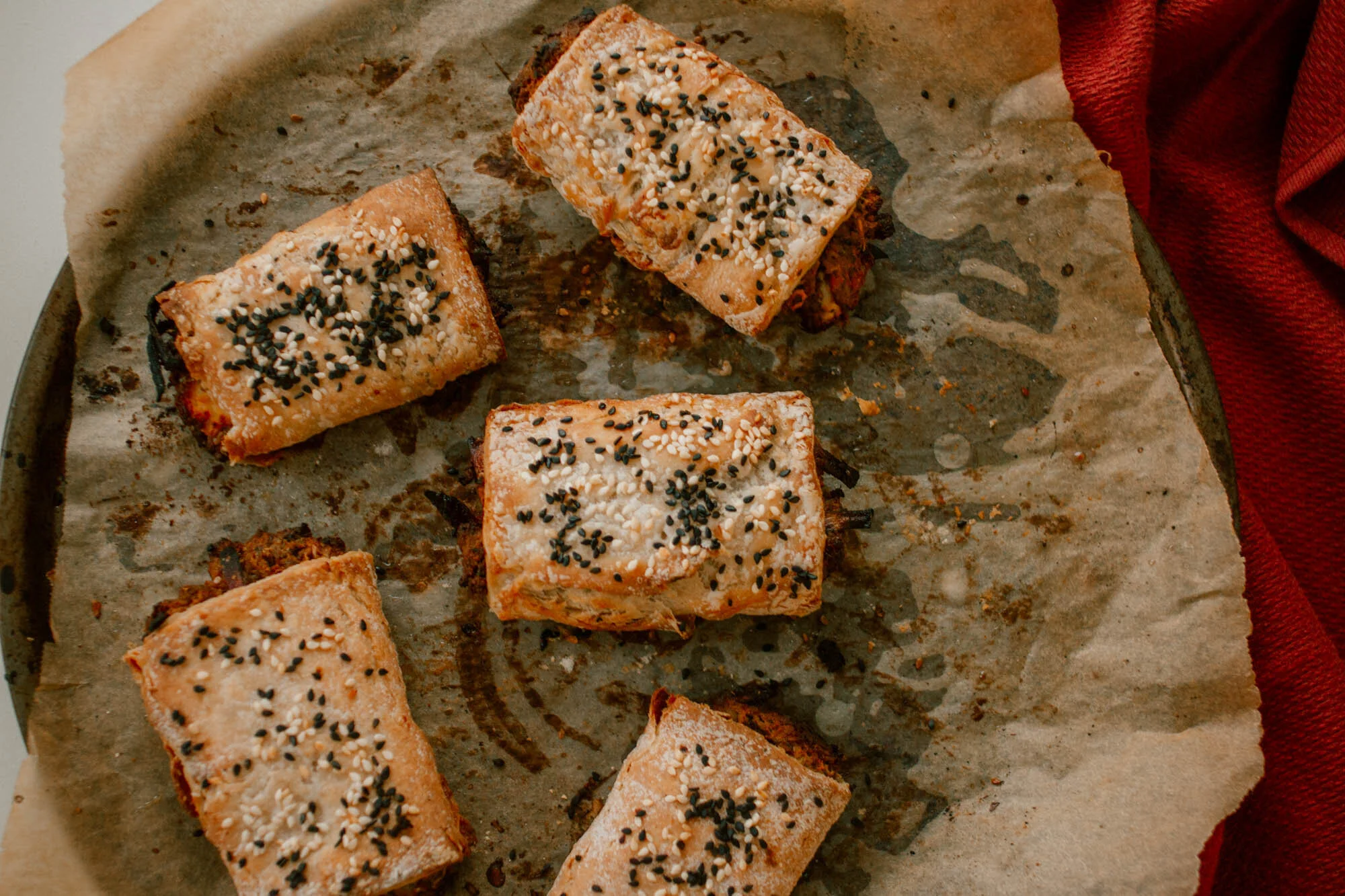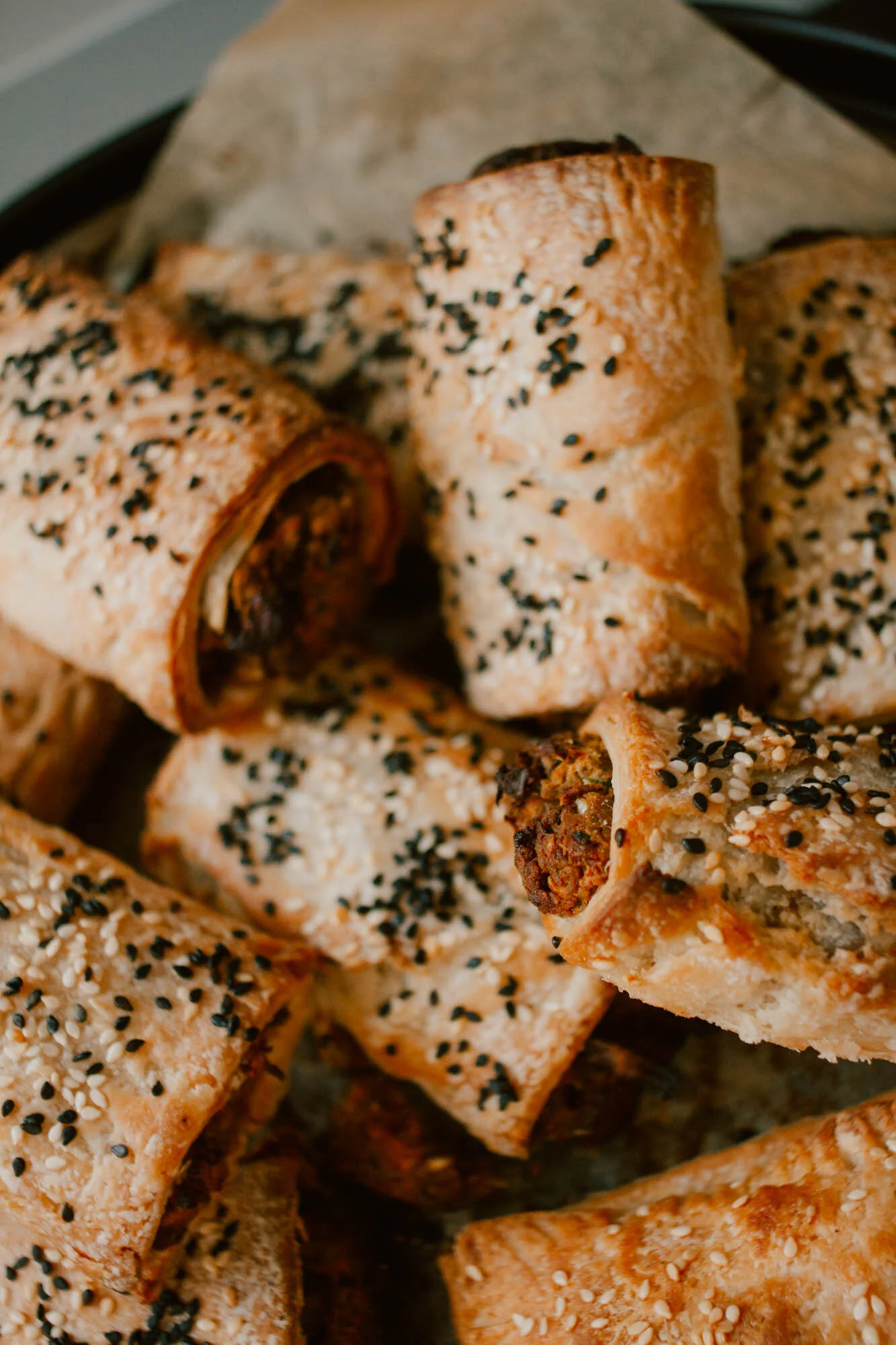 Allowing around 1cm of pastry on the side, put a sausage of the mixture along the pastry allowing enough room on the other side to roll the pastry over and overlap with the 1com you left on the other side. Roll the rollover so the overlapping pastry is on the bottom. Brush the rolls with milk and then garnish with sesame seeds